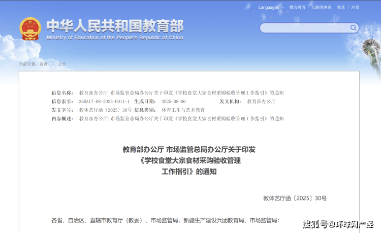 【全球网报道 记者 陈全】记者9月25日育部获悉,为切实落实食物平安“四个最严”的要求,落实《地方办公厅、国务院办公厅关于进一步强化食物平安全链条监管的看法》,深化全国中小学校园食物平安和炊事经费办理凸起问题专项整治,教育部、市场监管总局结合制定了《学校食堂大食材采购验收办理工做》(以下简称《工做》)。